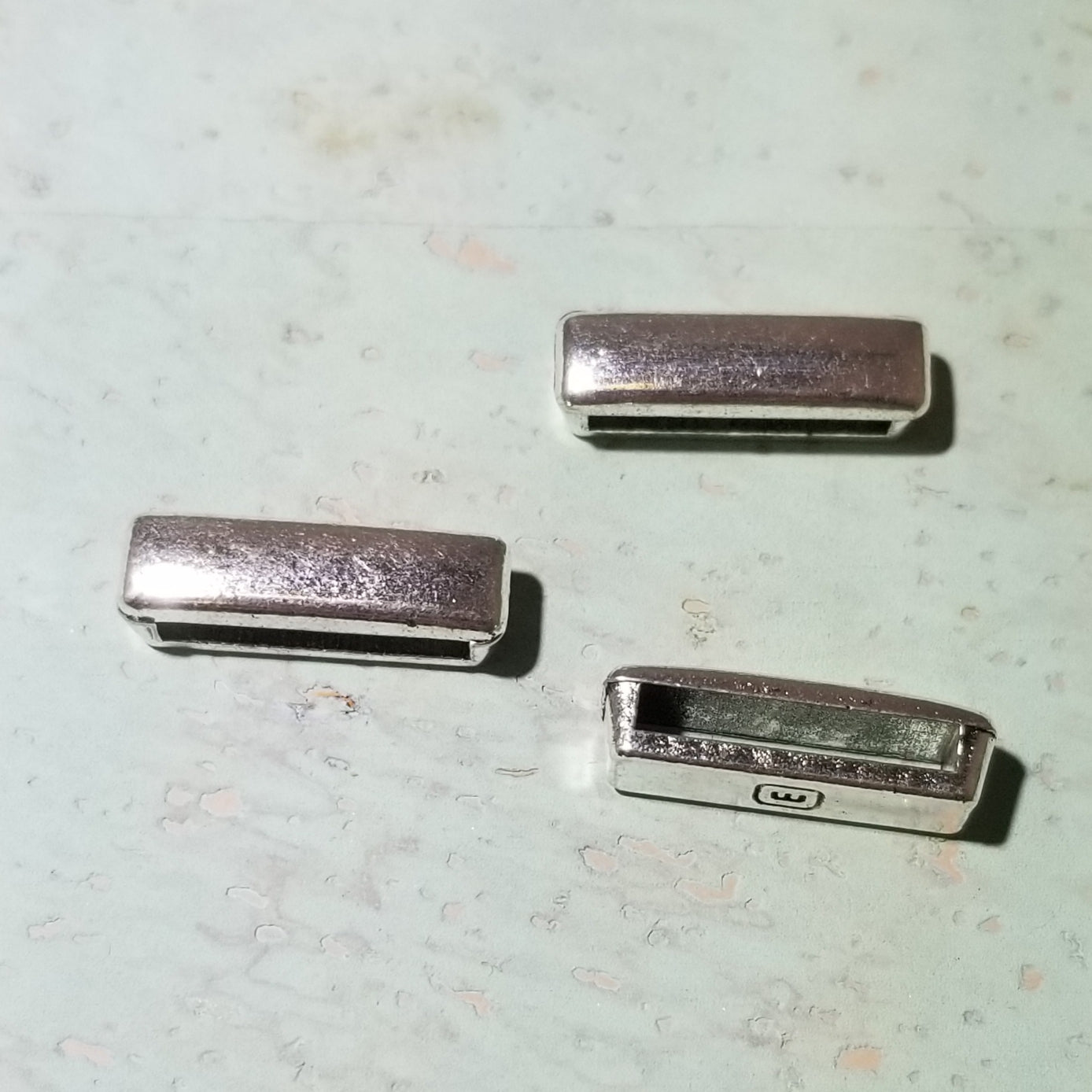 Flat silver slider that fits the 10 mm flat cording. No pattern on top.
