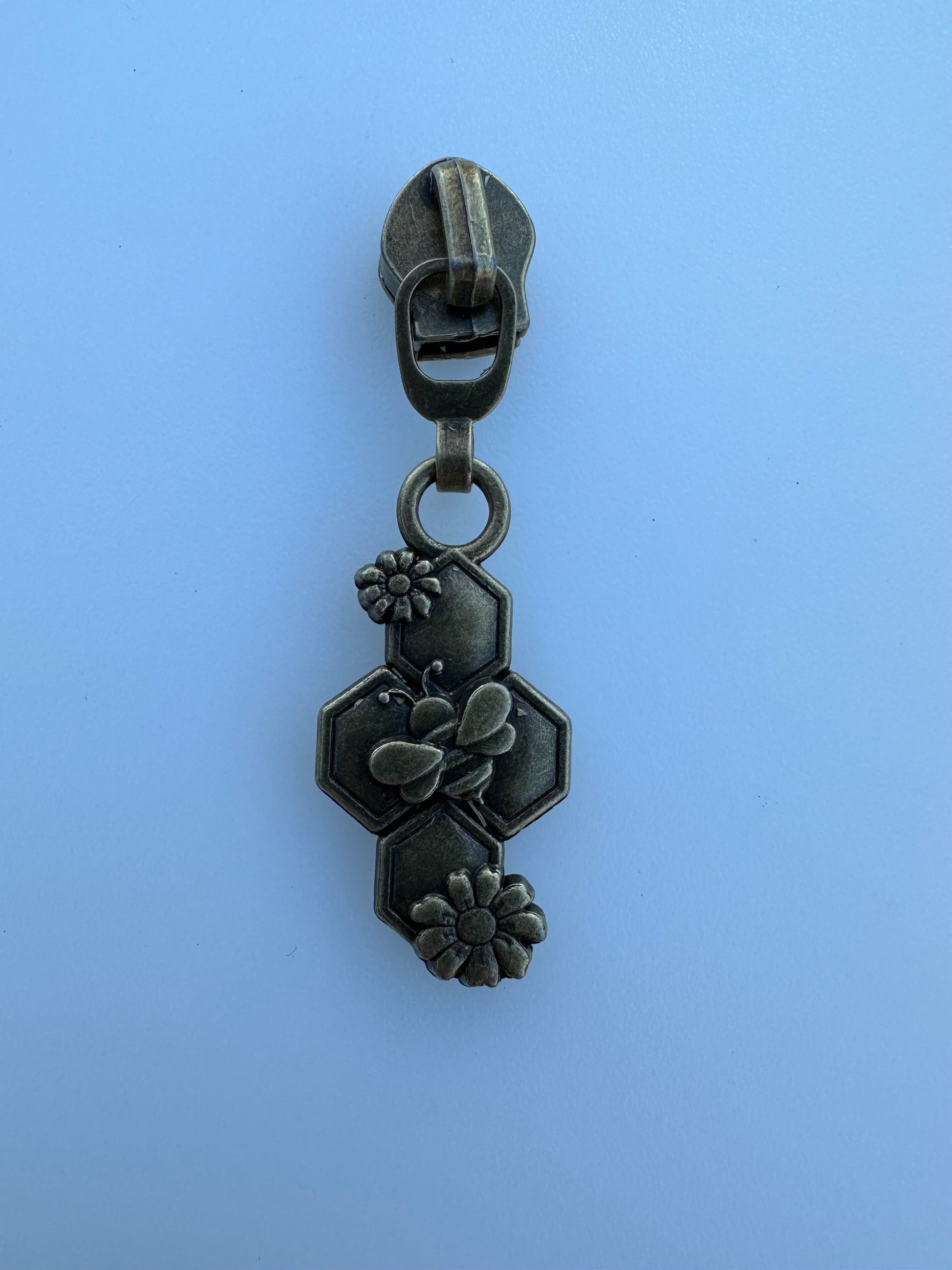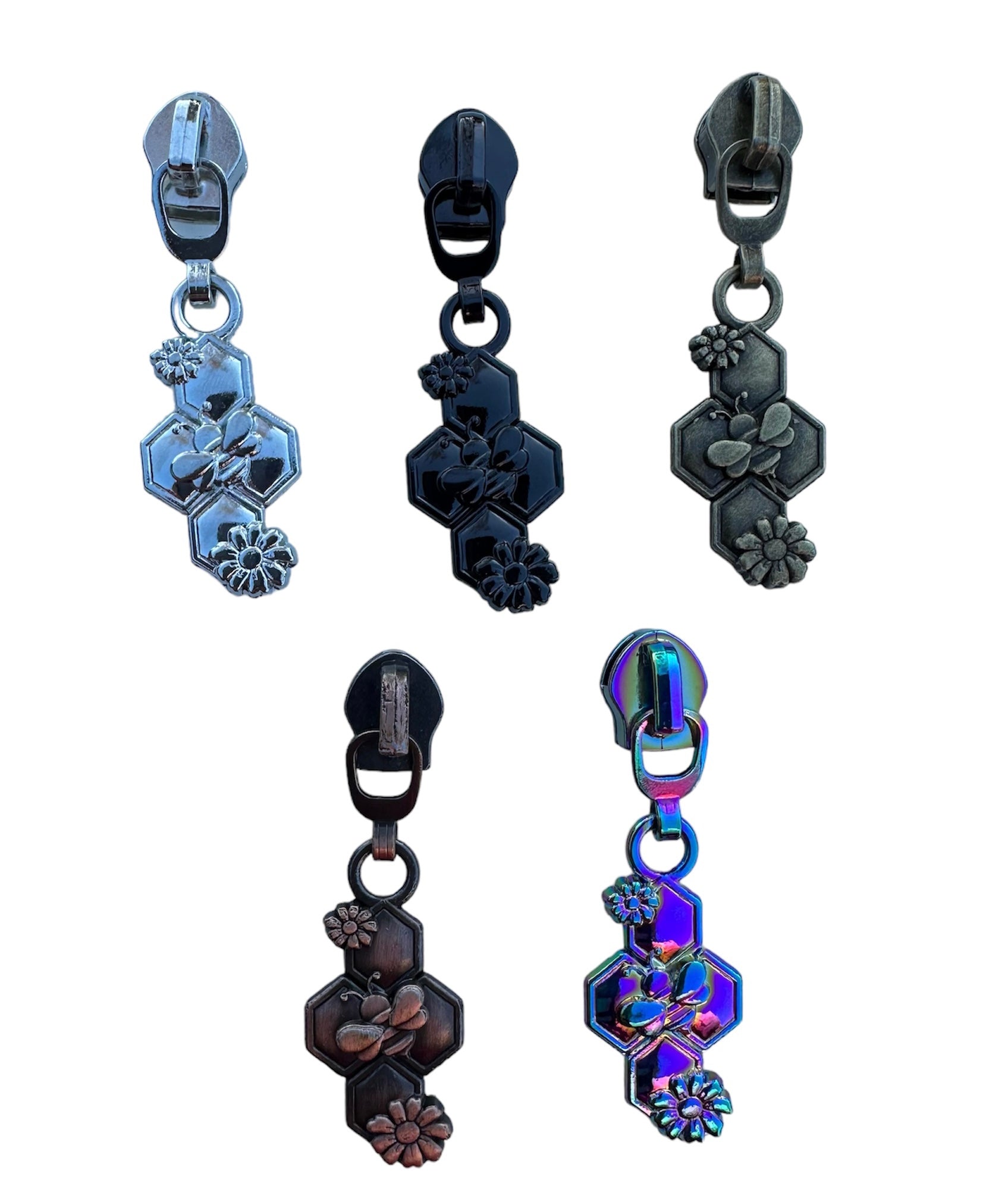 Bee and daisy on a honeycomb zipper pulls. Use with #5 nylon zipper tape.
