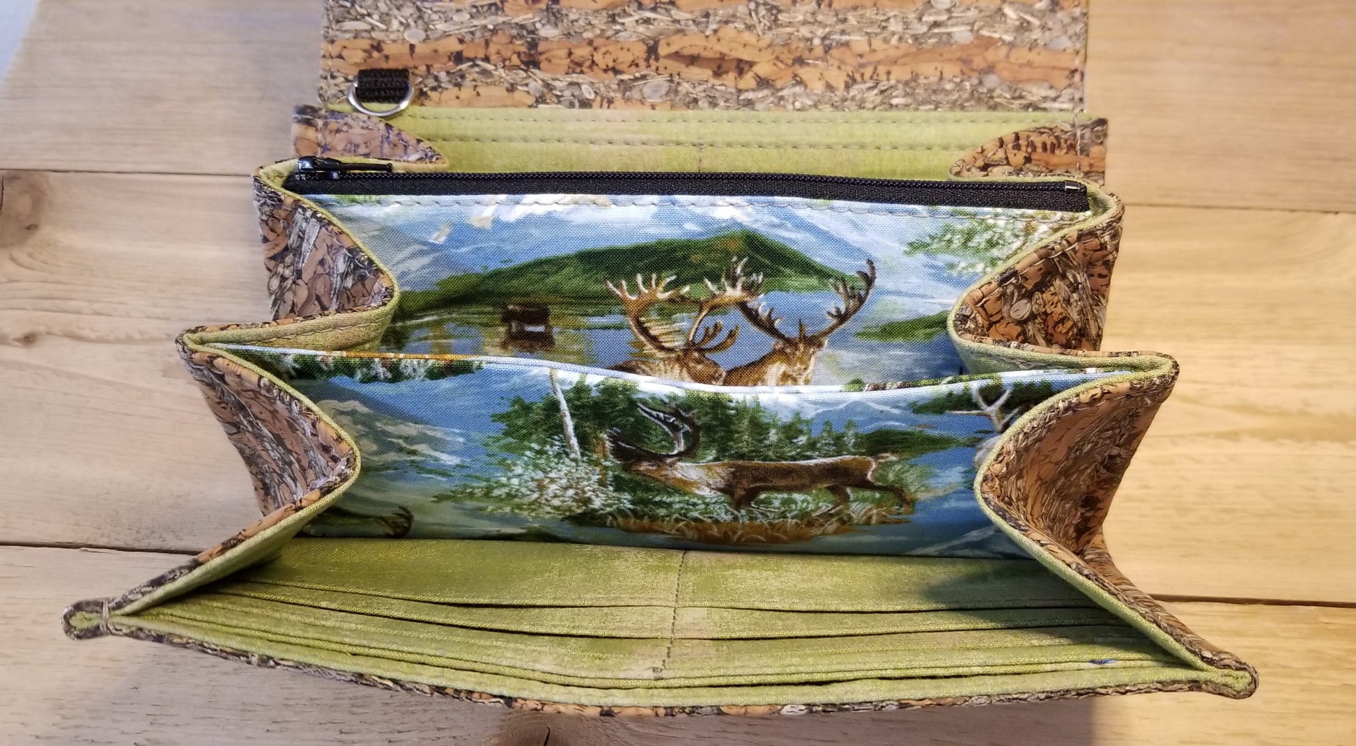These clutch wallets are made with a high quality cork fabric/leather and cotton fabric. They are nice and roomy and will fit a larger phone. They are made with a d ring to attach a wristlet. A wristlet can be added for $5. There are 12 card slots, 2 bill/receipt slots (one in the front and one in the back) as well as a zippered pocket. Special orders are welcome and a second d ring can be added to wear as a crossbody for an additional charge.