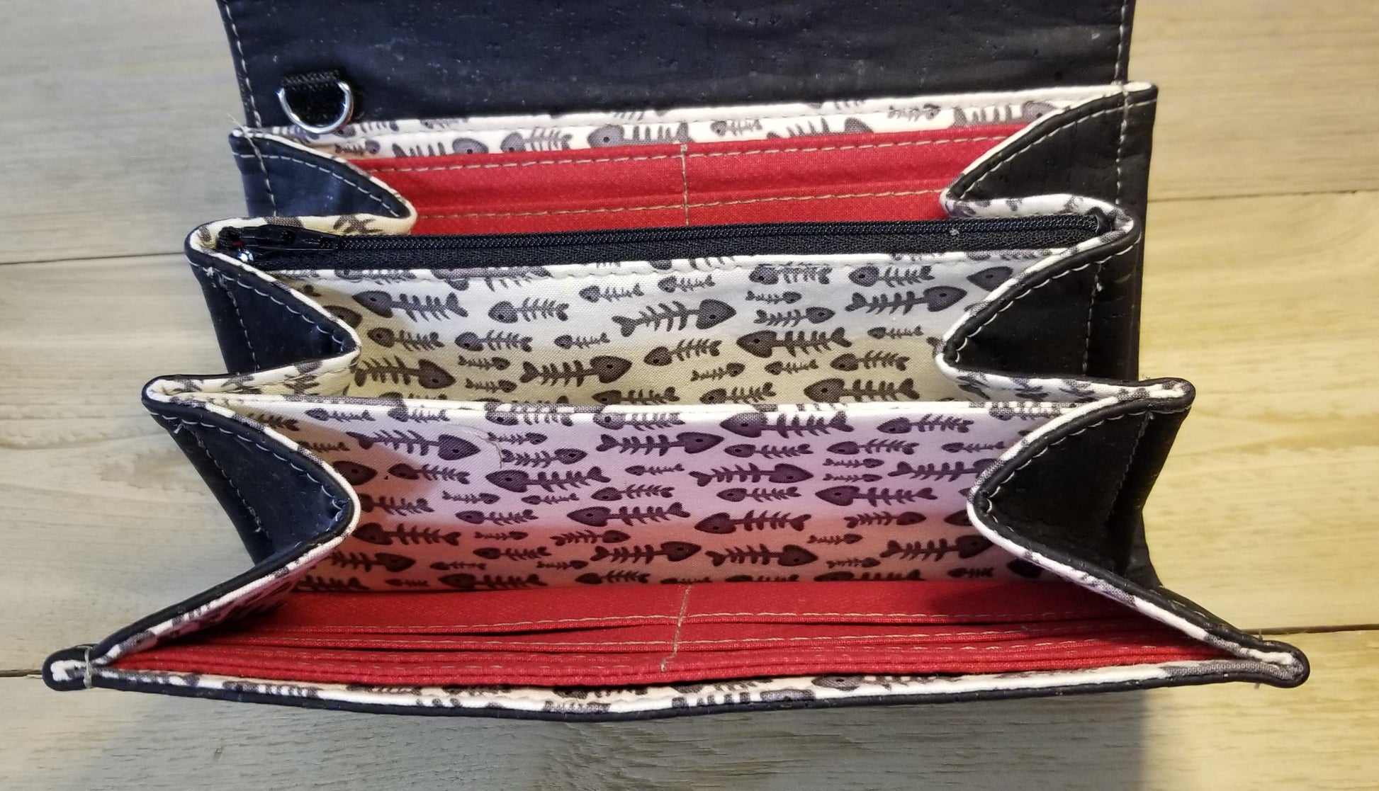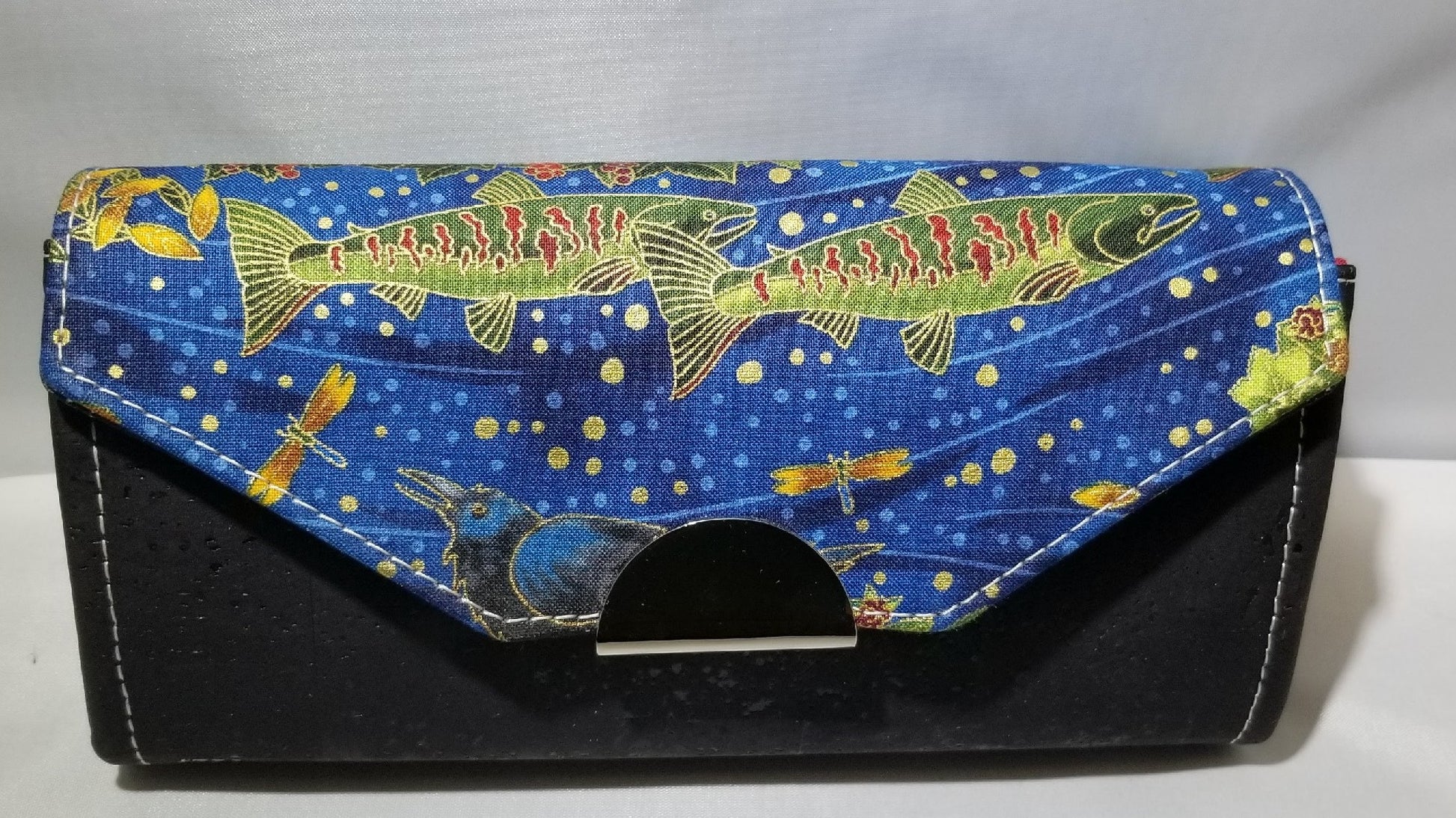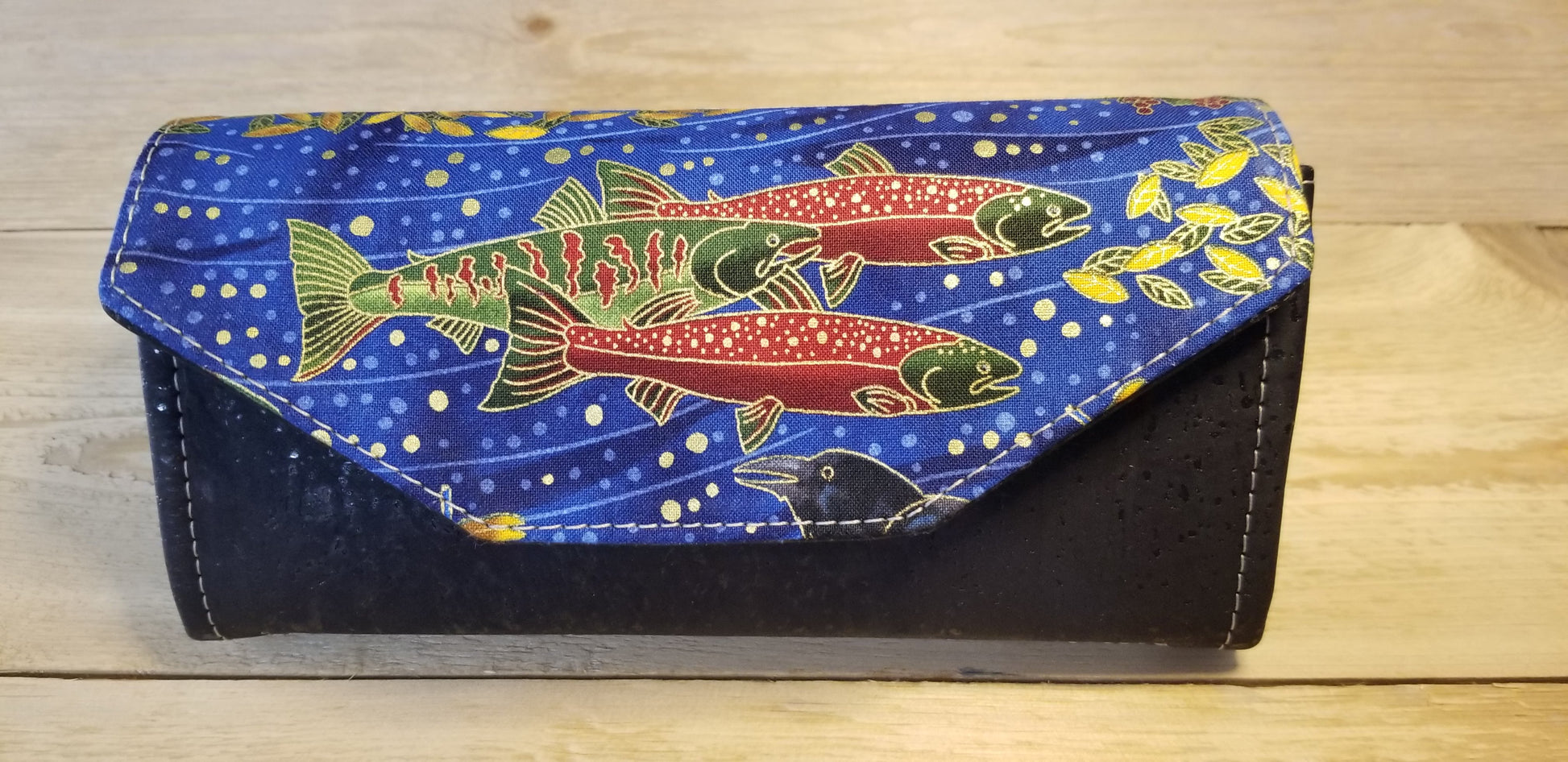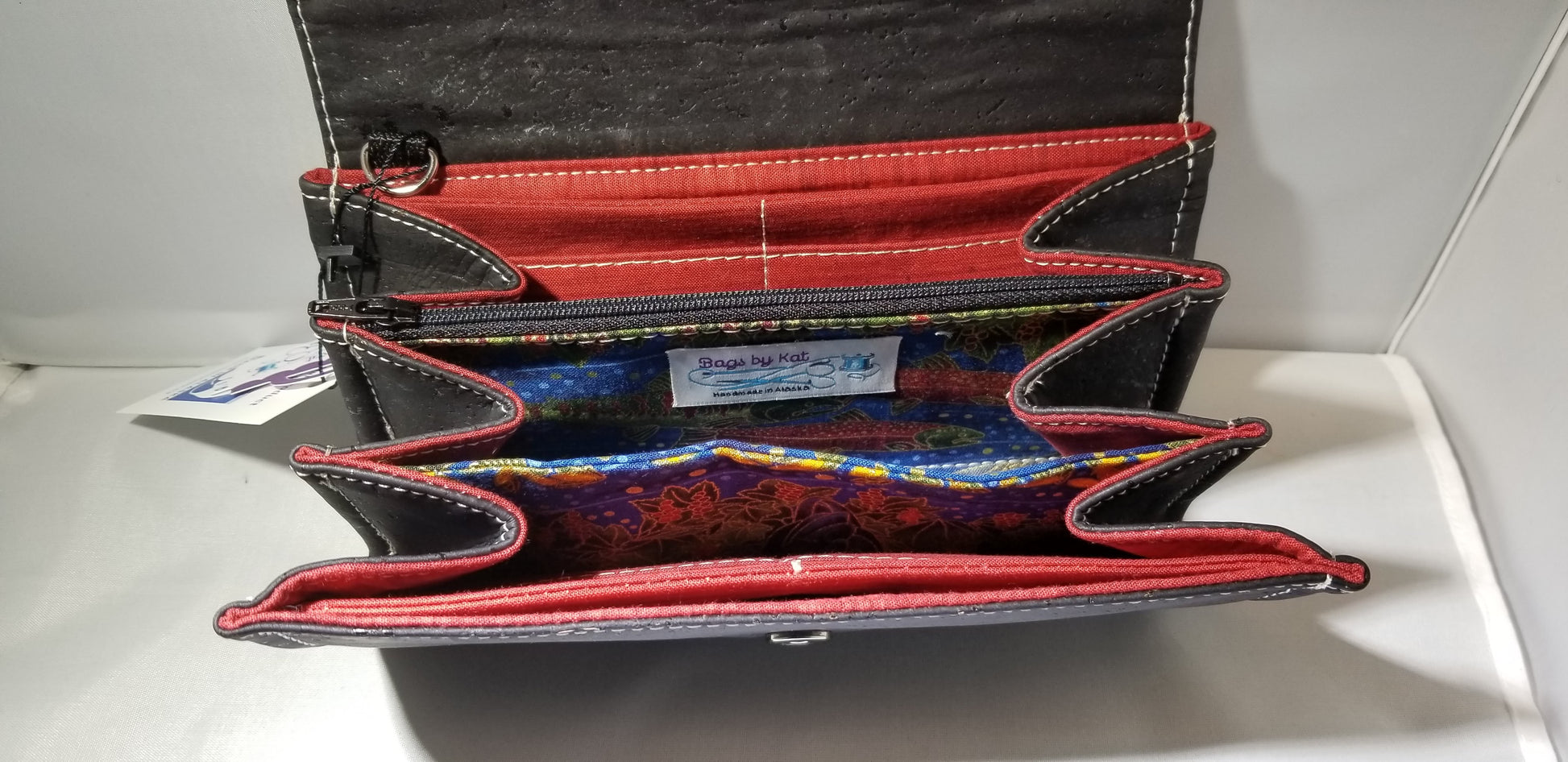 These clutch wallets are made with a high quality cork fabric/leather and cotton fabric. They are nice and roomy and will fit a larger phone. They are made with a d ring to attach a wristlet. A wristlet can be added for $5. There are 12 card slots, 2 bill/receipt slots (one in the front and one in the back) as well as a zippered pocket. Special orders are welcome and a second d ring can be added to wear as a crossbody for an additional charge. The Salmon w/moon refers to the closure on the front.