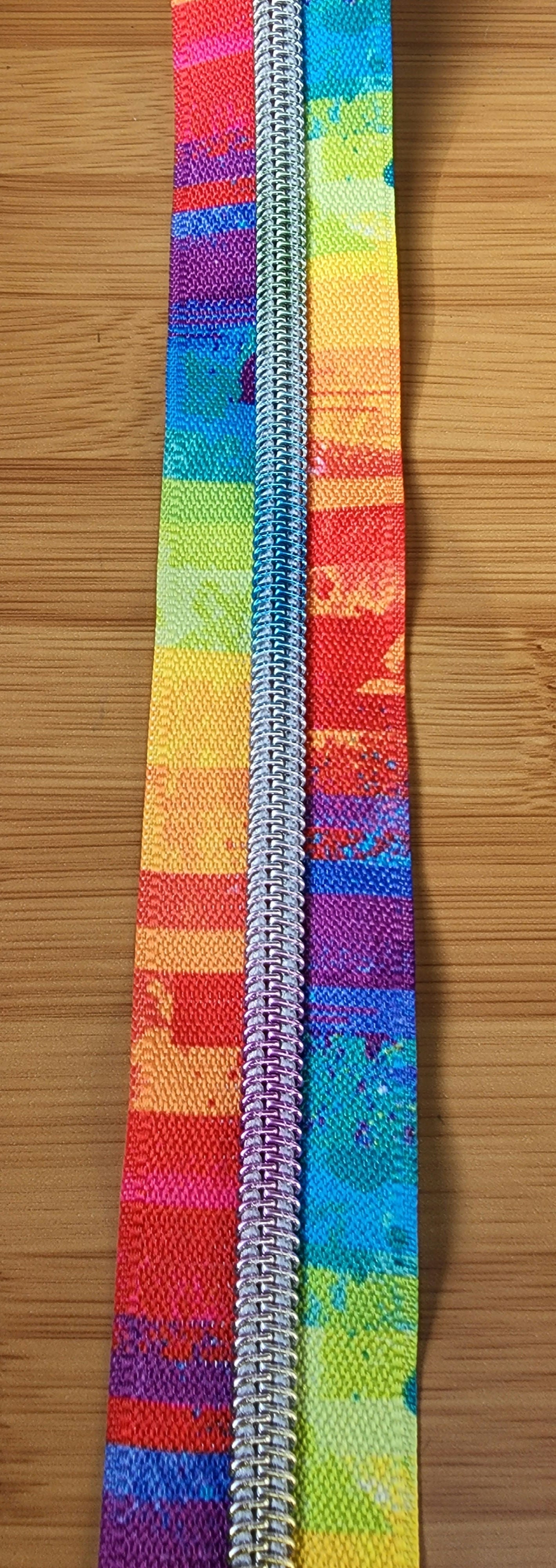 #5 nylon zipper tape features an abstract primary stripe print with silver/rainbow coil teeth. #5 zipper pulls sold separately.