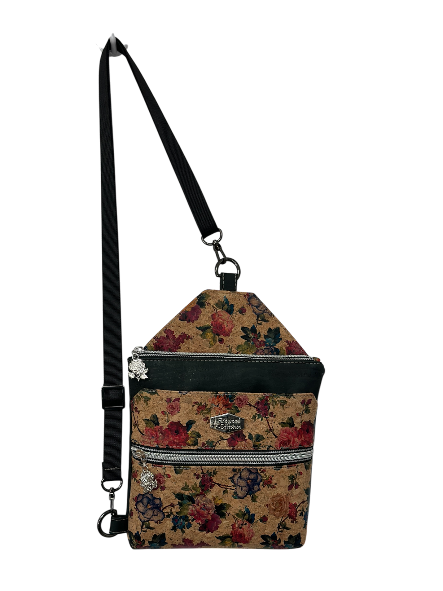 Features a front magnetic slip pocket as well as a front and top zipper.