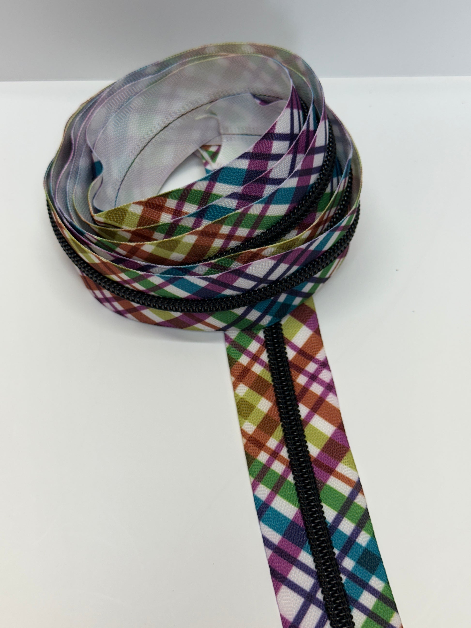 #5 nylon zipper tape features plaid stripe print with black coil teeth. #5 zipper pulls sold separately.