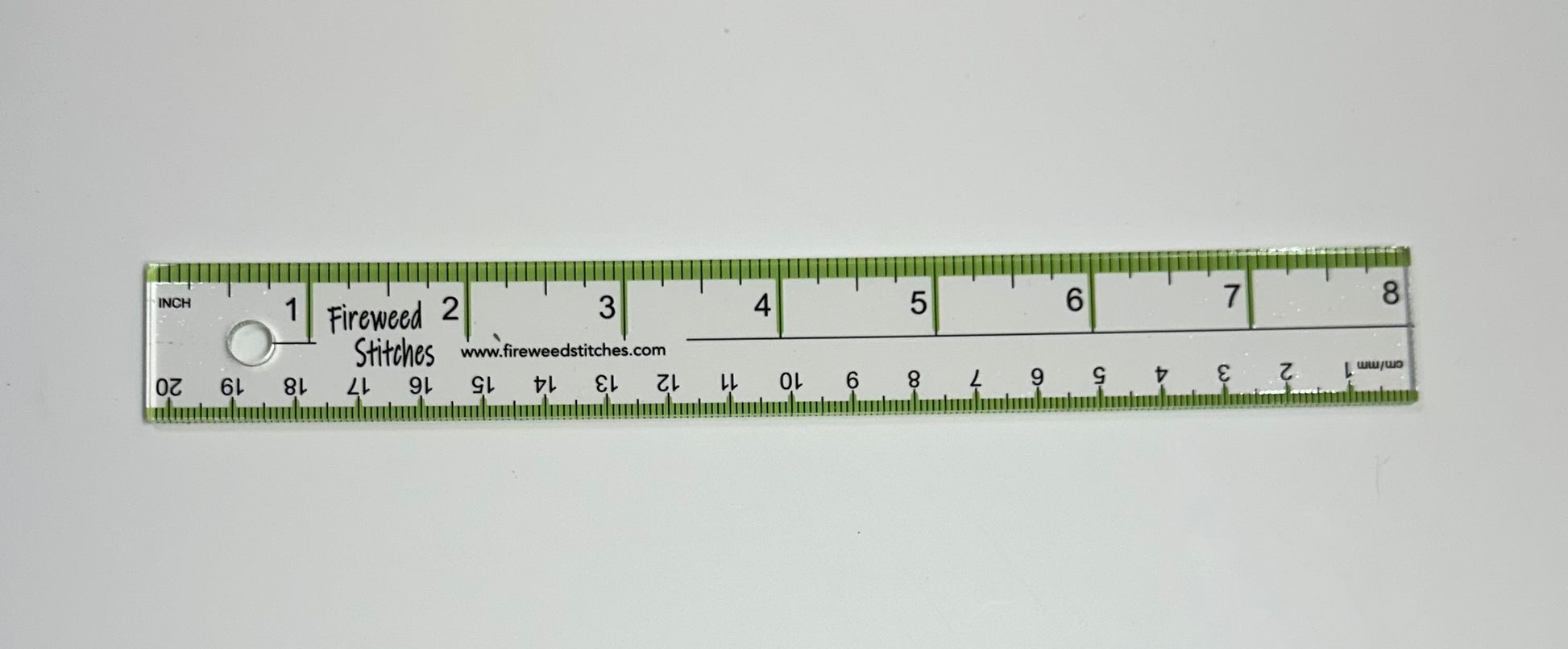 8" ruler that features inches on one side and mm on the other for easy gauging of sizes.