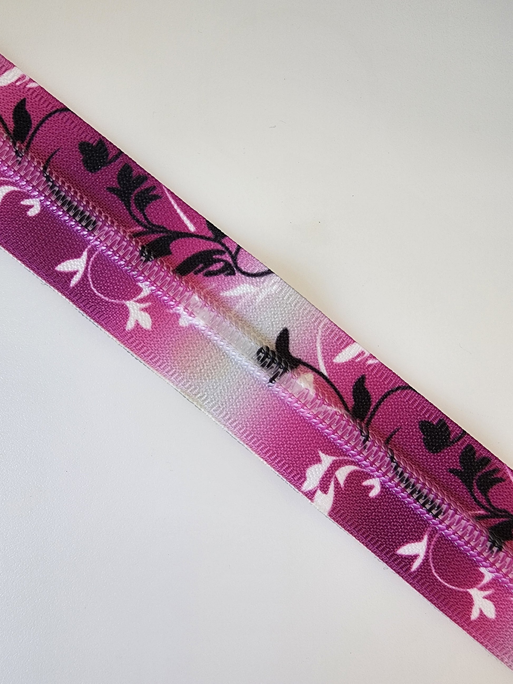 #5 Nylon coil zipper tape. Tape is printed on white and is beautiful with fuchsia, gray and white colors and black/white flowers.