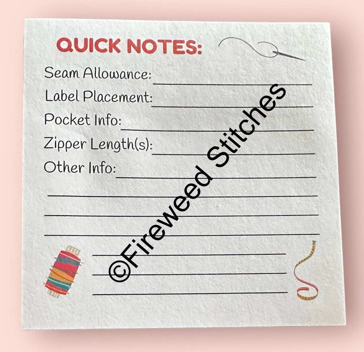 The Fireweed Stitches copyright across the image is not printed on the notes.