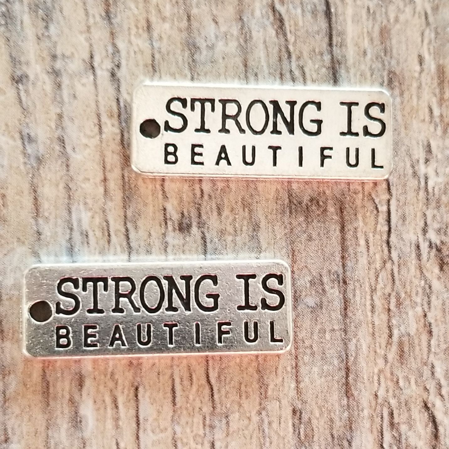 Strong is Beautiful word charm. 27 x 10 mm. Sold in packs of 5.